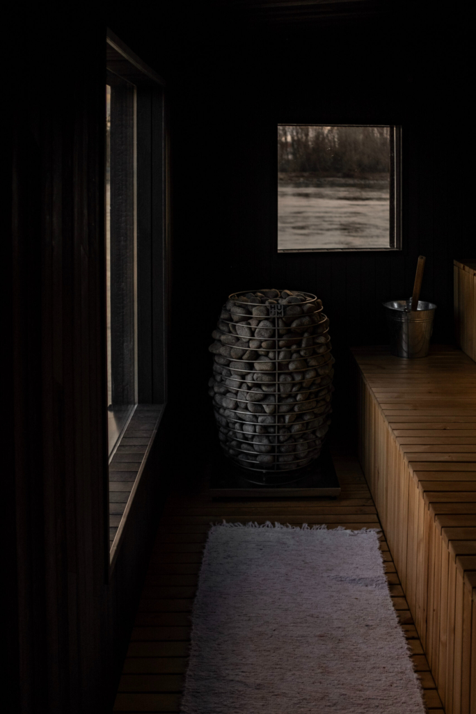 The sauna floats slightly above the floor, improving natural air circulation – a subtle echo of its position above the river. The ceiling is gently sloped, encouraging smooth steam movement throughout the space.
