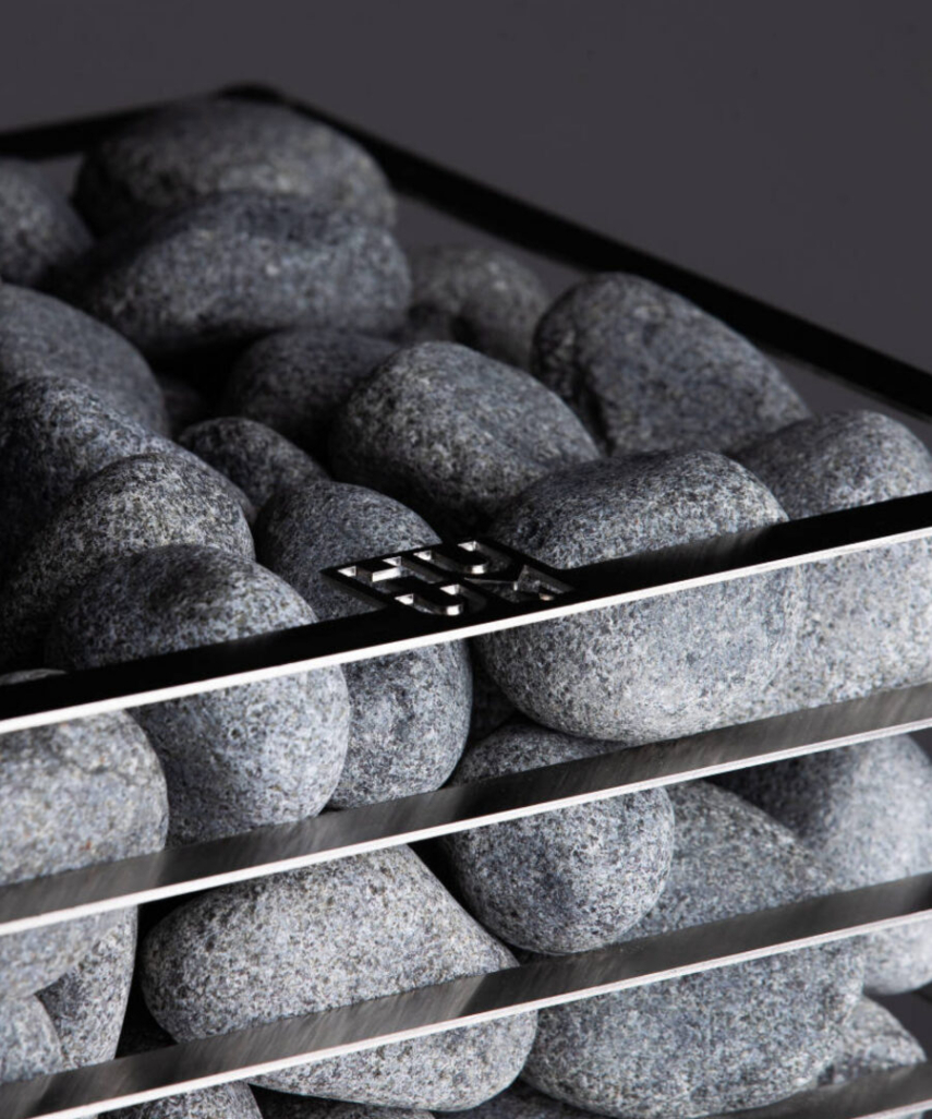 You regulate the heat and steam of the sauna by throwing water on the sauna rocks. The shape, size and composition of the stones, and their placement in the heater make all the difference. We recommend round sauna rocks because they provide milder steam. The round shape ensures that the water reaches inner stones and evaporates gradually instead of vaporizing in one go from the top layer. Sauna rocks are highly visible in HUUM sauna heaters, and you’ll need smaller and larger stones for filling the heater evenly without noticeable gaps. We suggest stacking a denser top layer with slightly smaller stones. This enhances the accumulation of heat.
